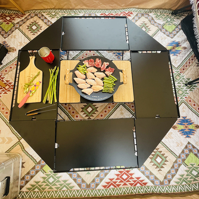 Lightweight portable folding camping table with multi-layer design. Perfect for outdoor camping, BBQ, and picnics. Compact iron table easy to carry.